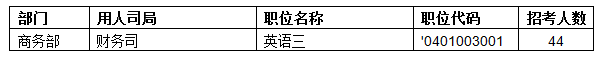 商务部财务司英语三代码为0401003001的职位专业要求相对宽泛,财税、金融、投资、贸易、财务、会计、工商等经济类专业,经济管理、财税管理、工商管理等管理类专业都可以报名,政治面貌以及基层工作经历不做要求,这个职位要求的亮点隐藏于备注之中:大学英语六级考试成绩达到70分(新计分500分)及以上,或雅思成绩6.5分及以上,或旧托福成绩600分(新托福成绩100分)及以上,从备注内容可看出,该职位对考生的英语能力要求相当高,建议英语成绩符合要求的考生可以考虑该职位。