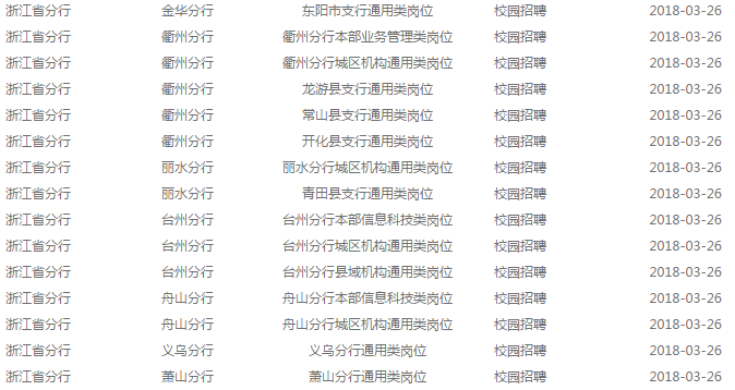 浙江银行考试网温馨提醒您关注浙江银行招聘信息:【2018中国农业银行浙江省分行春季校园招聘岗位表】